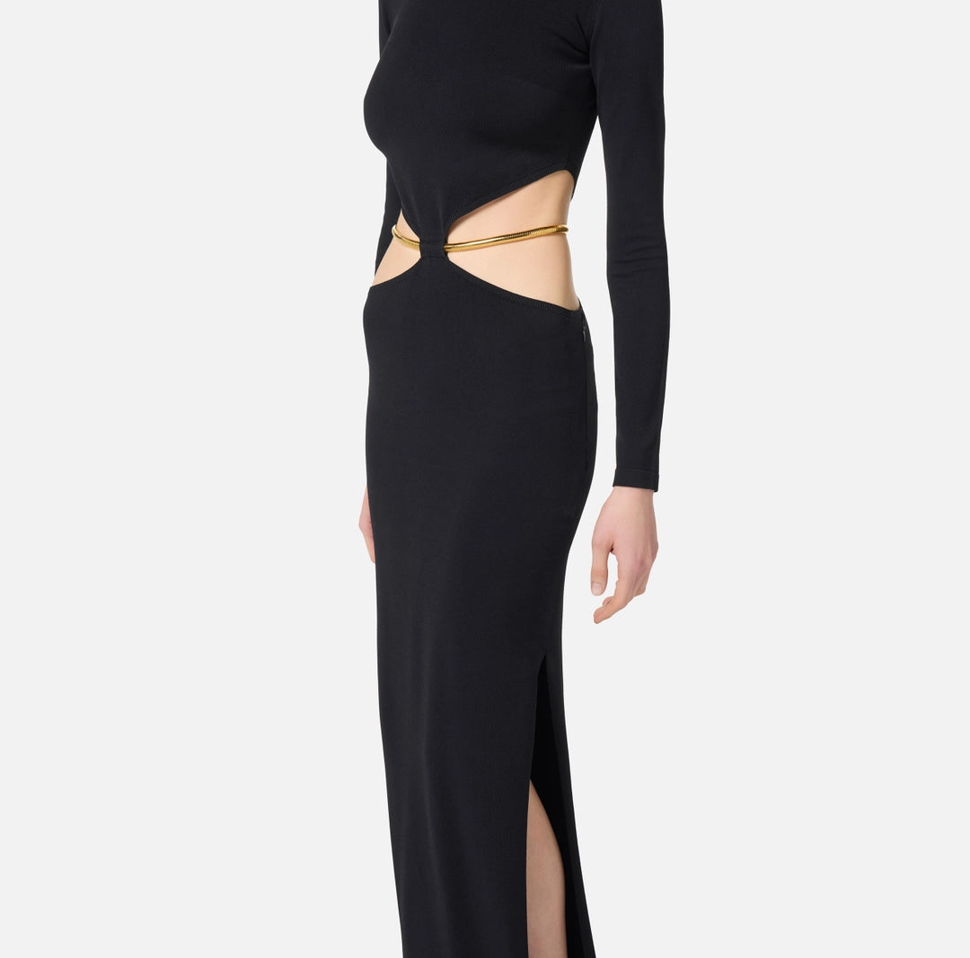 Abito da sera in maglia dalla vestibilità slim. Il vestito ha girocollo, maniche lunghe e si distingue per i tagli cut-out in vita che rivelano i fianchi, impreziositi dalla cintura in trama snake amovibile e flessibile per sperimentare più opzioni di styling.