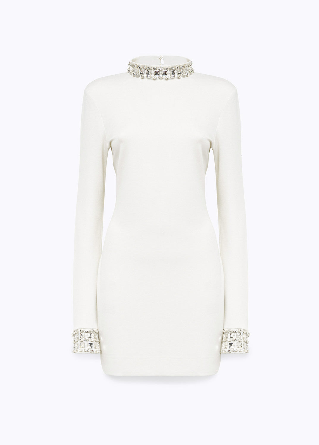 Allure speciale in un attimo con l'abito corto in jersey di viscosa stretch decorato da ricamo fatto a mano di cristalli. Ha scollatura a v profonda sul retro, maniche lunghe, chiusura con bottoni e asole, linea fitted. Un jewel dress che non passerà inosservato.