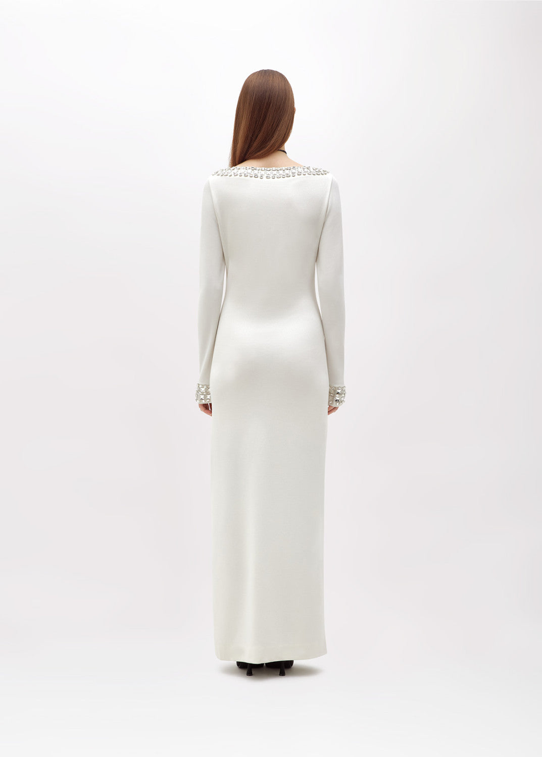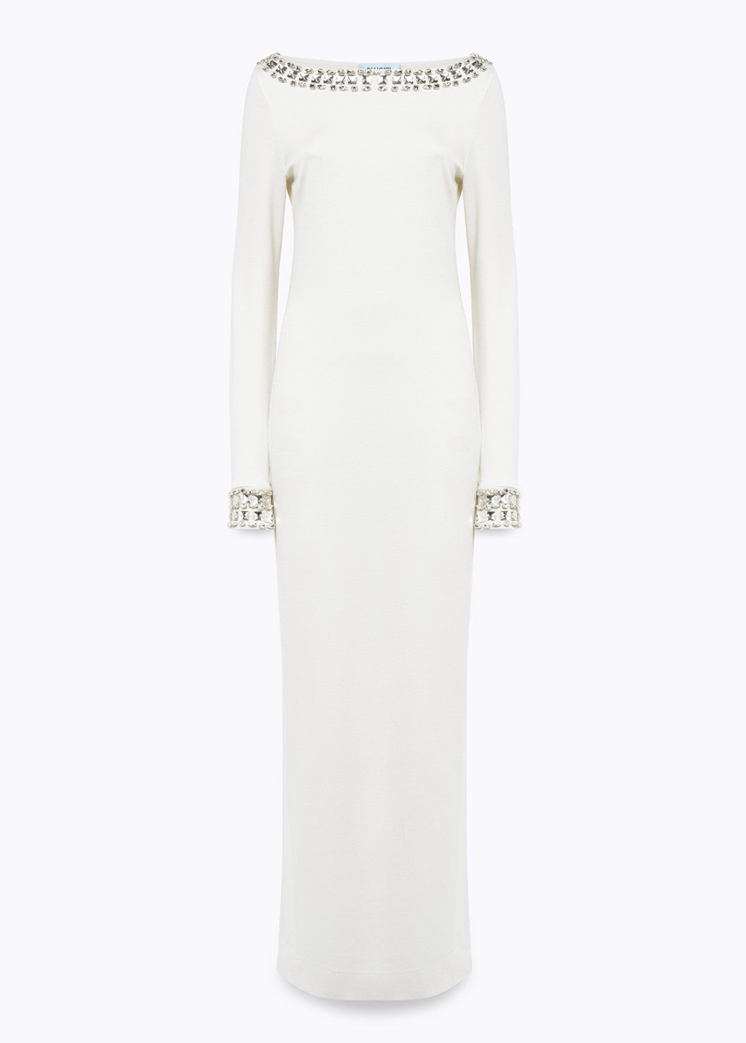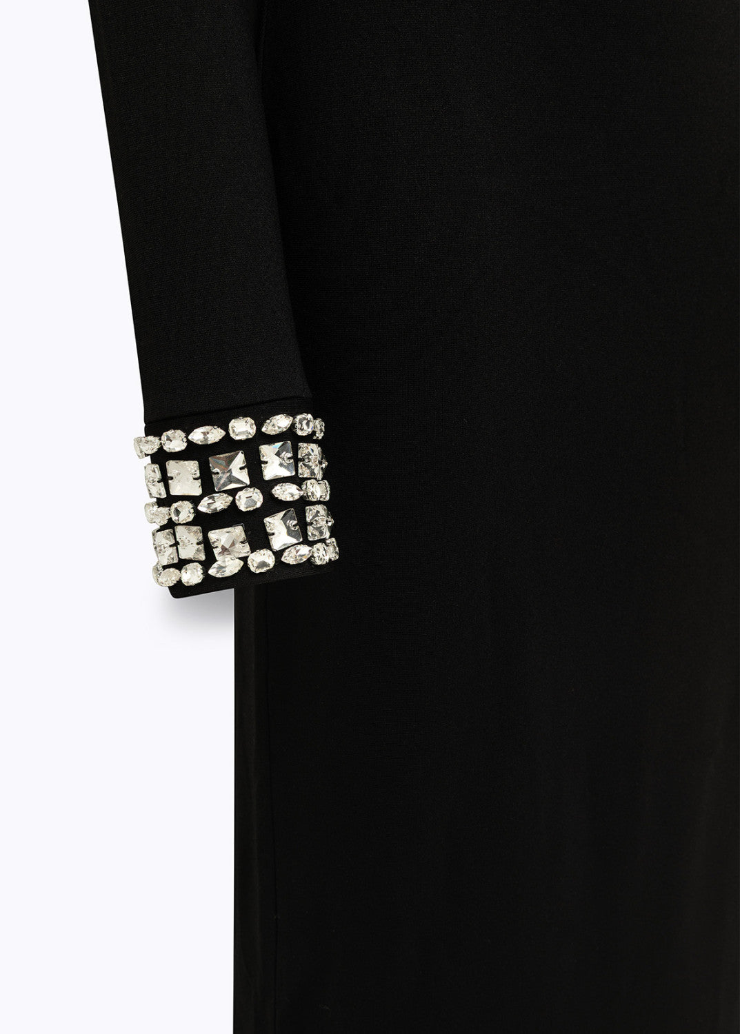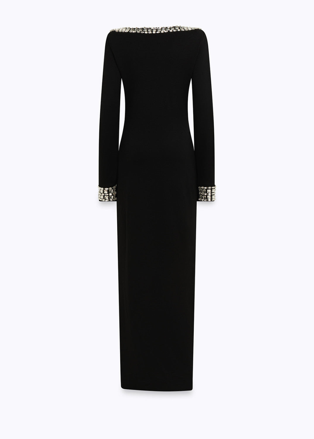 Per outfit che lasciano il segno. Abito in jersey di viscosa lungo con scollo a barchetta e polsi impreziositi da ricamo gioiello fatto a mano con cristalli, spacco profondo e linea fitted.