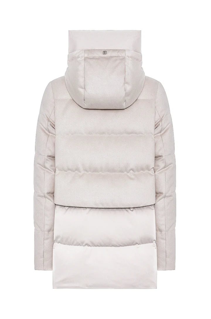 Lana tecnica leggera in struttura diagonale appena percettibile caratterizzata da morbidezza, aspetto pulito in superficie e resistenza al pilling, utilizzata in combinazione con tessuto tecnico water-resistant con struttura a raso. L’iniezione diretta di piuma grazie a una speciale lavorazione sul rovescio restituisce un’estrema leggerezza e permette la termoregolazione del corpo, preservando il microclima interno al capo.