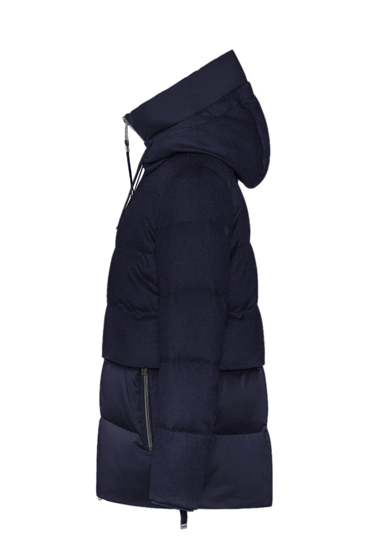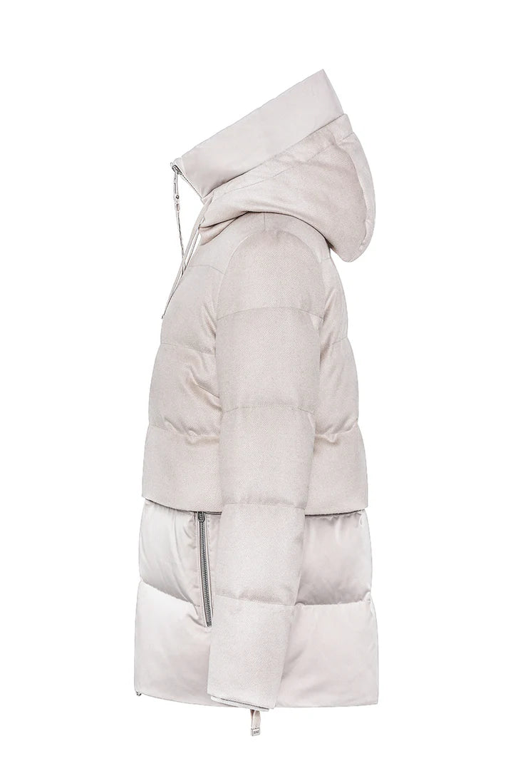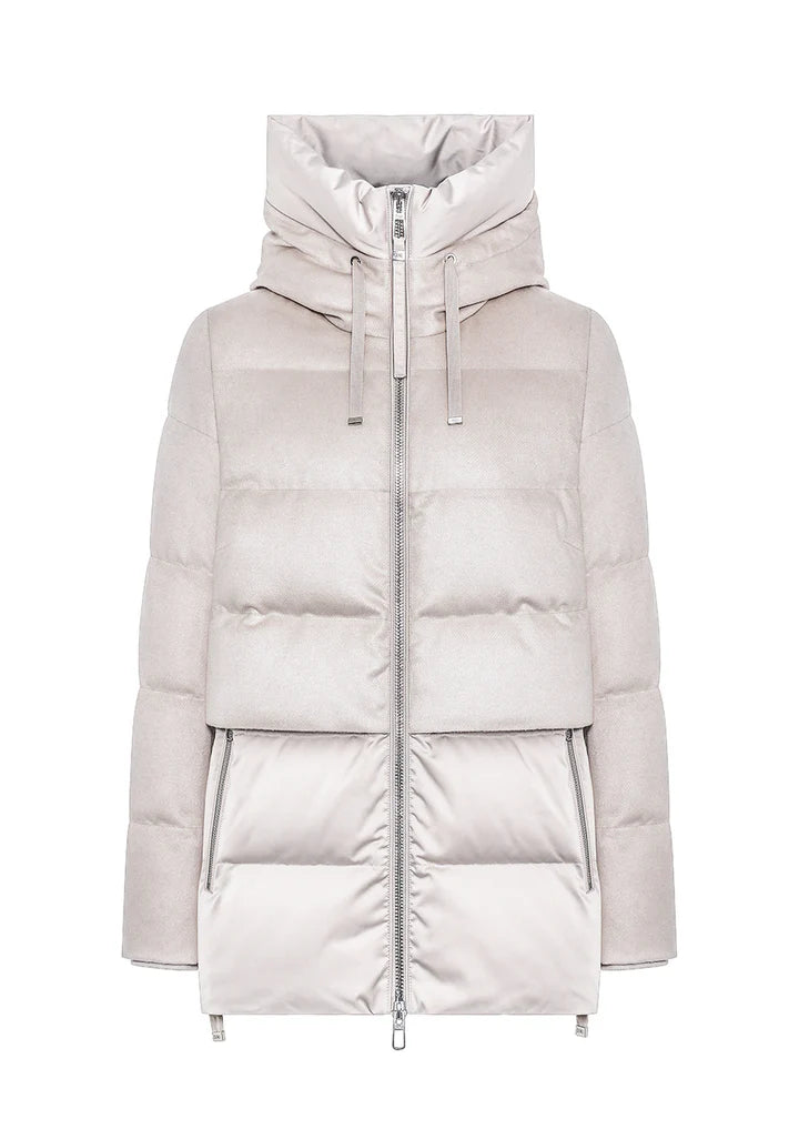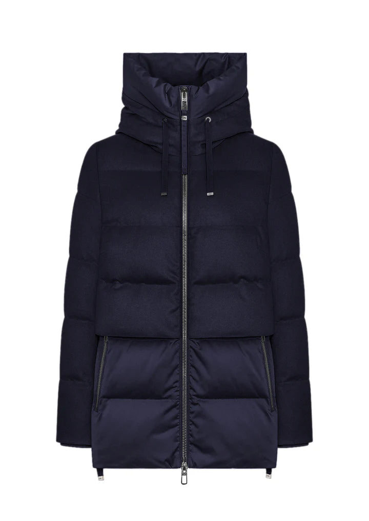 Piumino corto bi-materiale con imbottitura in piuma realizzatocon la combinazione di lana tecnica trapuntata e raso. Il capo è caratterizzato da ampio cappuccio imbottito regolabile con coulisse, chiusura frontale con zip metallica doppio cursore e tasche laterali con zip. Coulisse sul fondo per regolarne la vestibilità e polsino interno in maglia tecnica.