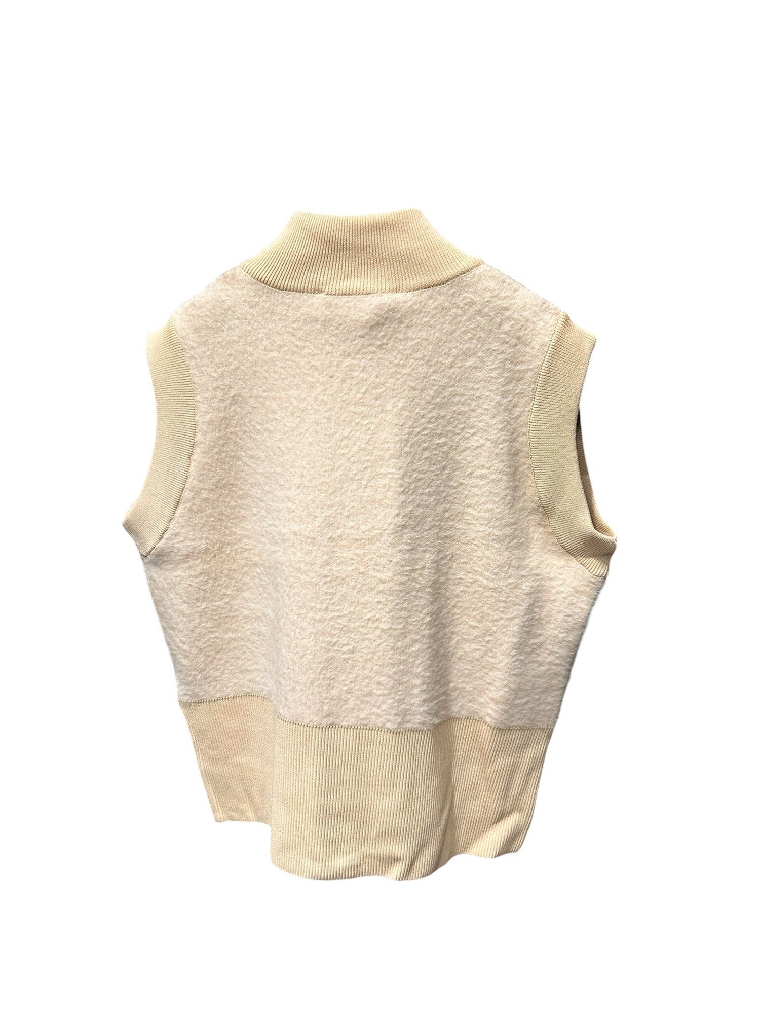 Da indossare a pelle o in look layering, il gilet in filato effetto pelliccia ha una linea essenziale e confortevole. Collo alto, chiusura con bottoni gioiello, fondo alto a costine, taschino applicato, finiture in viscosa. Perfetto da interpretare in una miriade di look, anche in abbinamento ai pantaloni in coordinato.